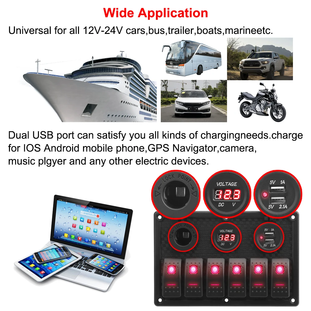 • 8 boat switch panel and 6 Rocker LED Switches Panel is a new generation of switch panel-prefect suit for applications in car, boats, trucks, yachts caravans, etc. With modern fashion design, Ultra Slim and Flexible Face Plate, it makes the back of the cockpit space become more clean and with less wires. Tight water proofing cap greatly enhanced the infiltration of the water features.