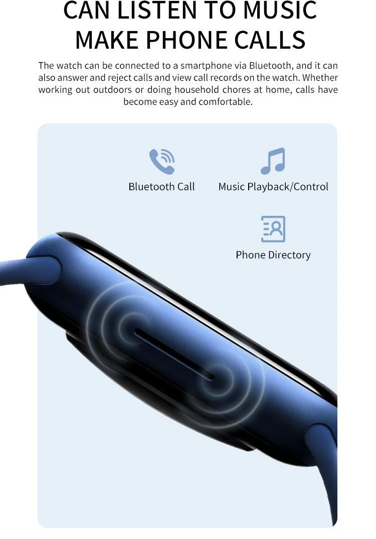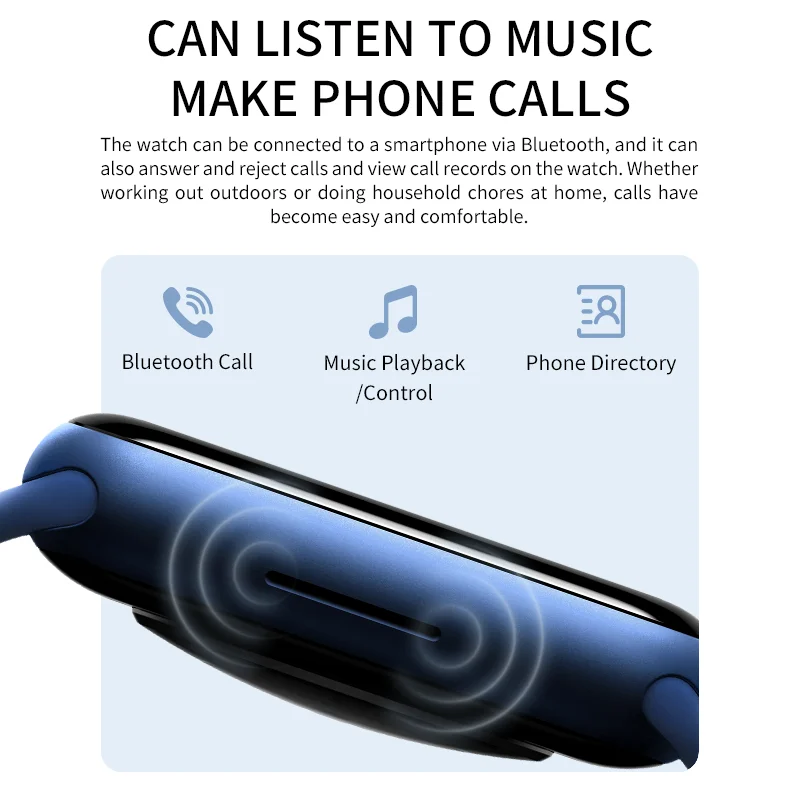 Music control:After connecting the phone, the watch can control the phone' s music player When the phone is playing music, you can use the watch to control the phone to play/pause, previous and next operations.