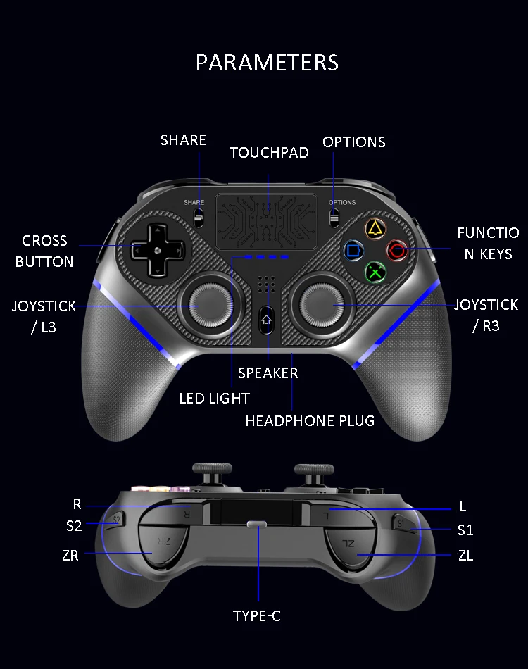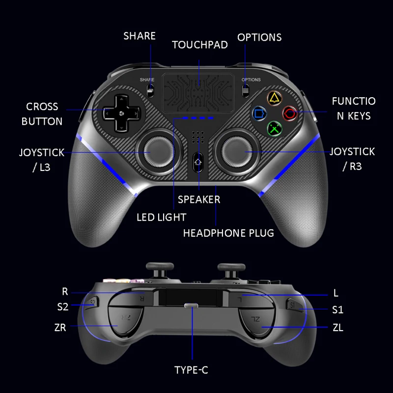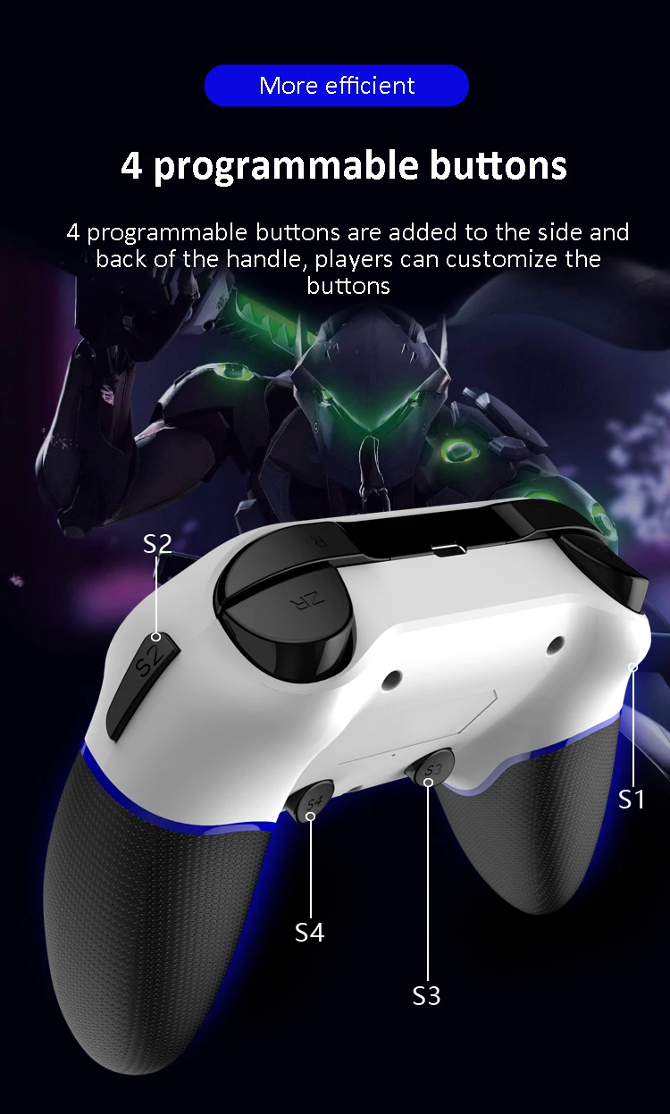 1.Total 4 programming functional buttons(S1,S2, S3 and S4).Two at the left and right of the controller and the other two at the rear of controller. And can be programmed according to your own preference