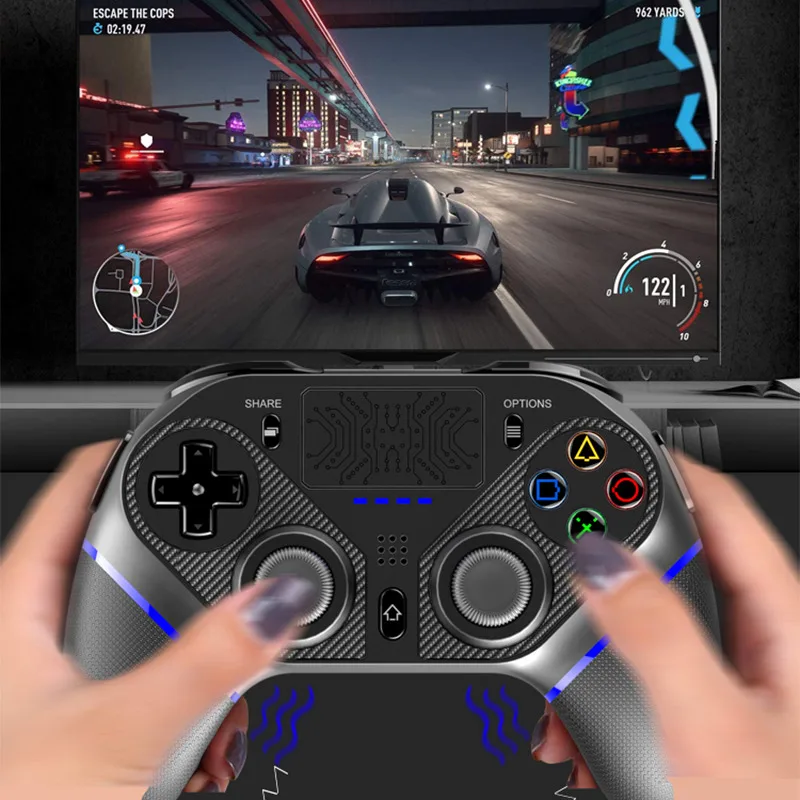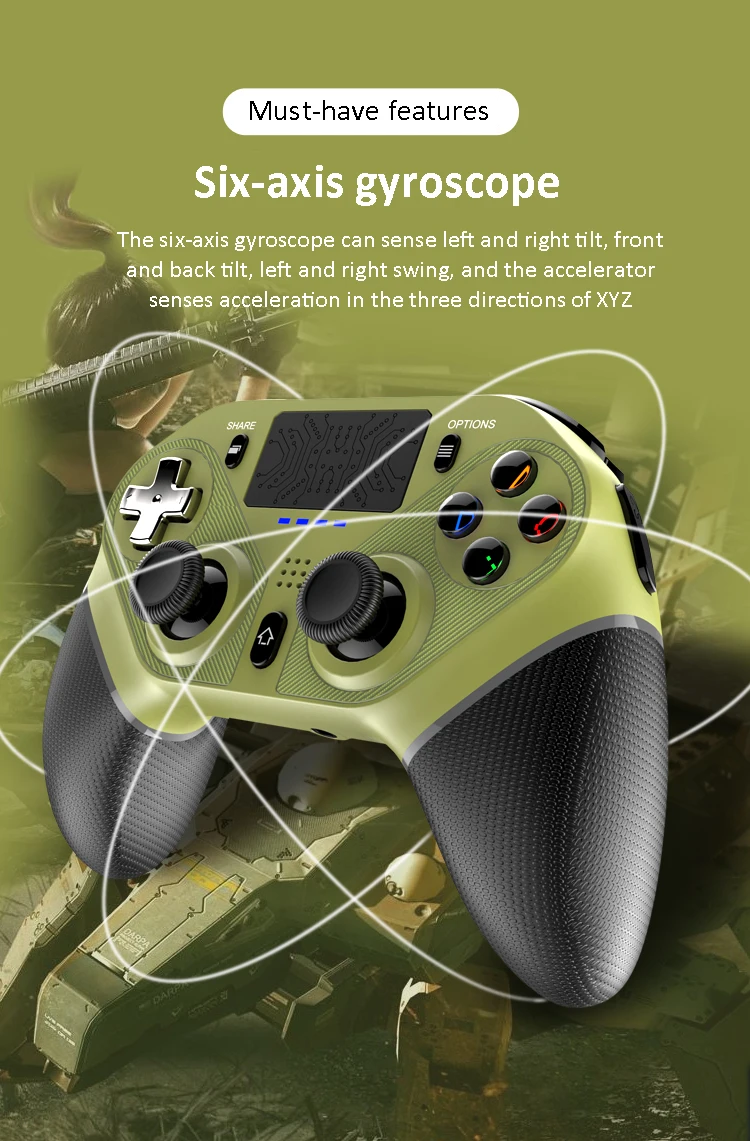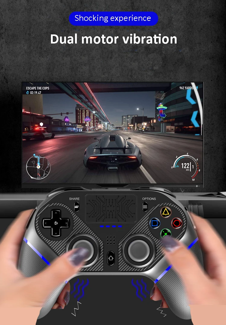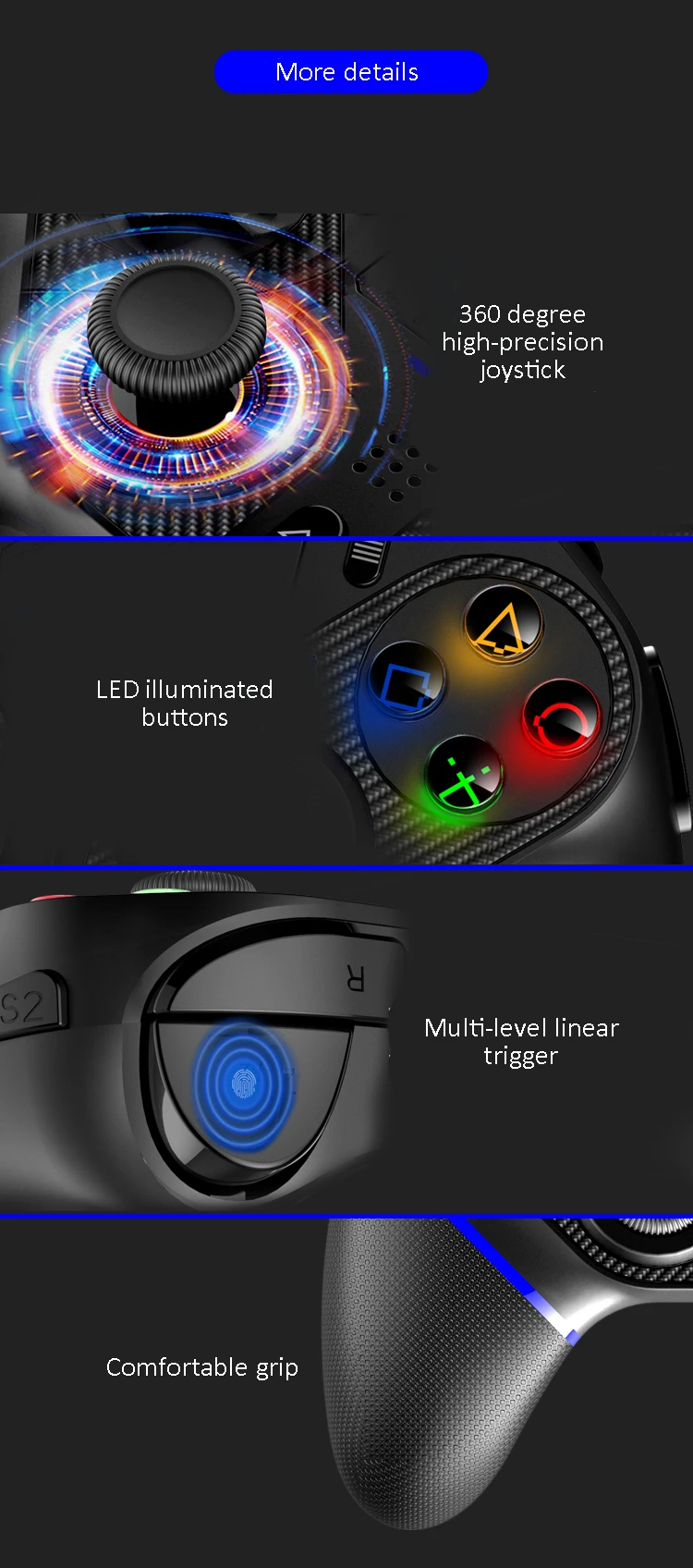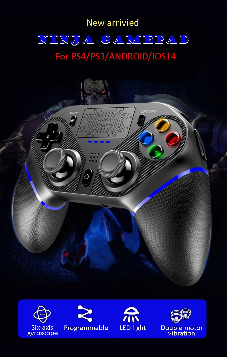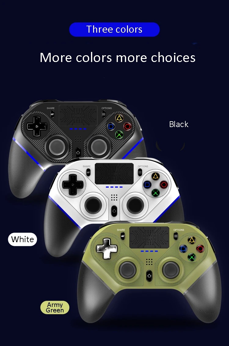 3.Built-in LED colorful light, the gamepad has colorful LED light bar to indicate the gamepad channel function and status. The indicator function is the same as the original P4 gamepad. Different gamepad are indicated by different color.