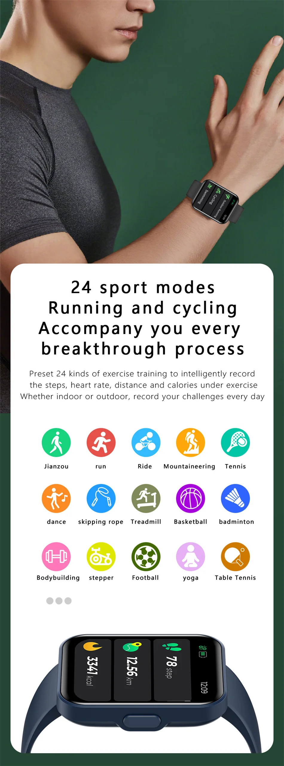24 exercise modes, heart rate detection, blood pressure detection, blood oxygen detection, pedometer, standard exercise functions (step counting, distance, calories), GPS track exercise. Time and date display, step count, calories, distance with screen display, sleep monitoring (sleep time, sleep quality).