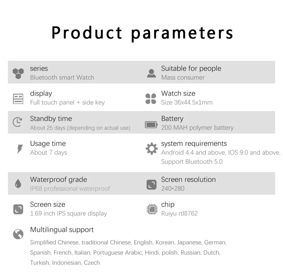 Product specificationsDisplay: 1.69-inch TFT HD; 240*280 resolution