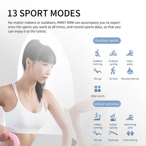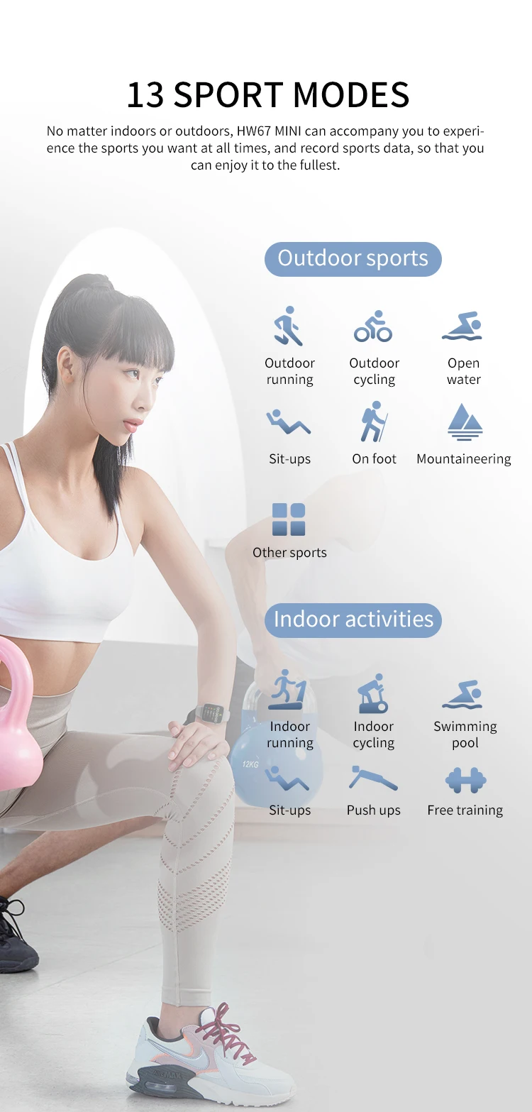 The HW67 mini Smartwatch is equipped with multi-sports modes to suit any of your needs, including indoor and outdoor running, walking, Free movement, Push-up, Sit-up, indoor and outdoor cycling, Mountaineering, and Free training.