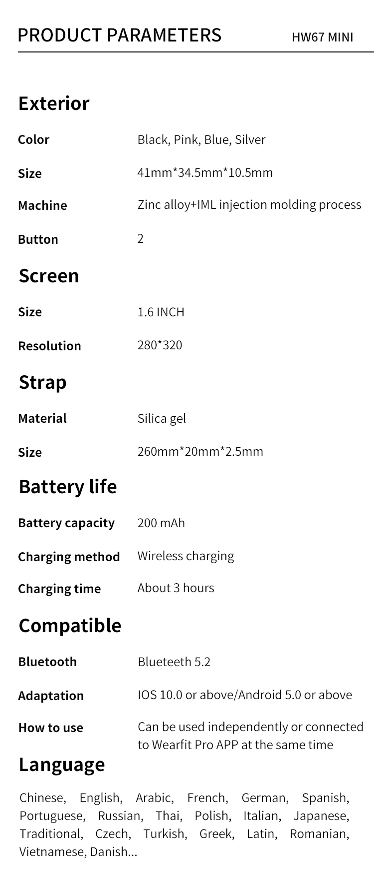 Watch Language | Chinese, English, Arabic, French, German, Spanish, Portuguese, Russian, Thai, Polish, Italian, Czech, Turkish, Greek, Latin, Romanian, Vietnamese, Danish. |