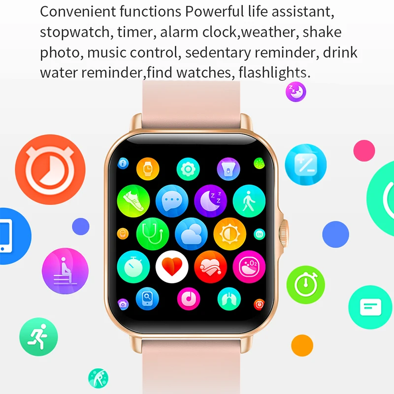 • Function : Heart rate/Sleep monitoring/blood pressure/Blood oxygen/Multi-sports mode/Information and social information push/incoming call/Alarm clock/Sedentary reminder/Stopwatch/Find phone/Remote camera