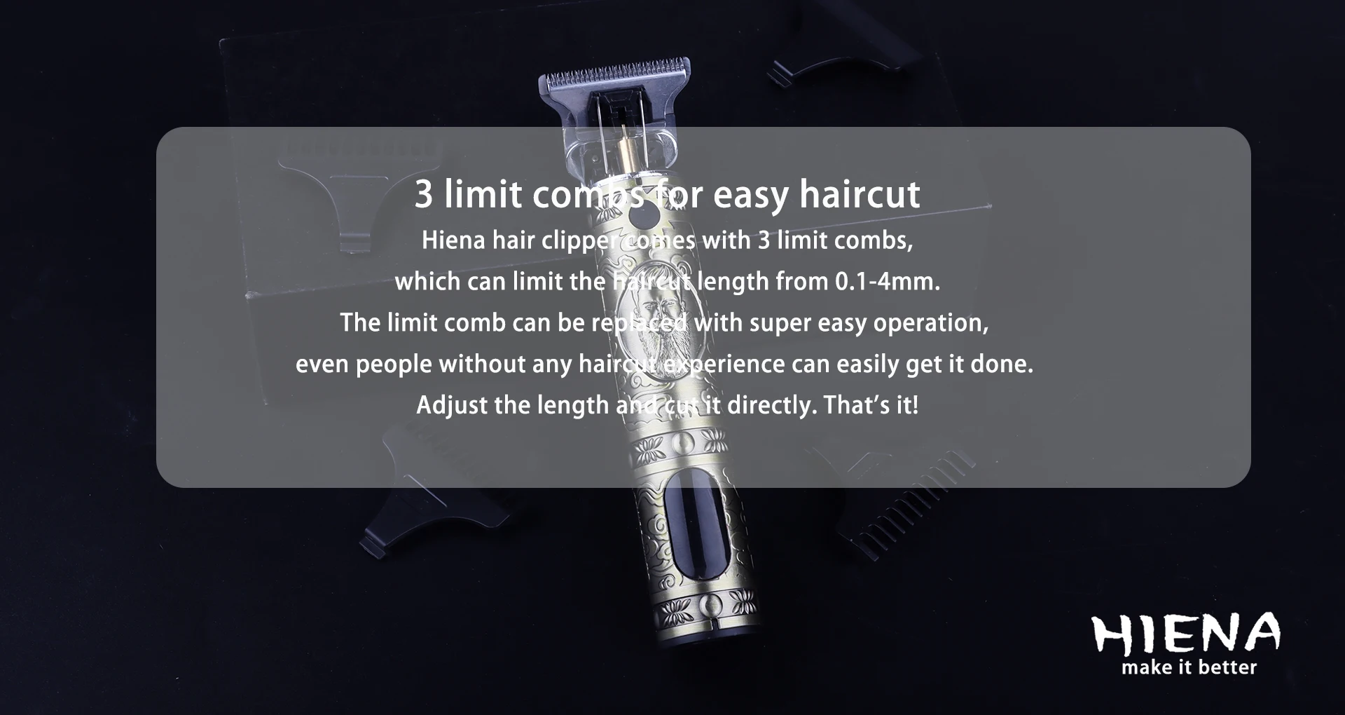 Hiena hair clipper comes with 4 limit combs, which can limit the haircut length from 0.1-4mm. The limit comb can be replaced with super easy operation, even people without any haircut experience can easily get it done. Adjust the length and cut it directly. That\\\'s it!