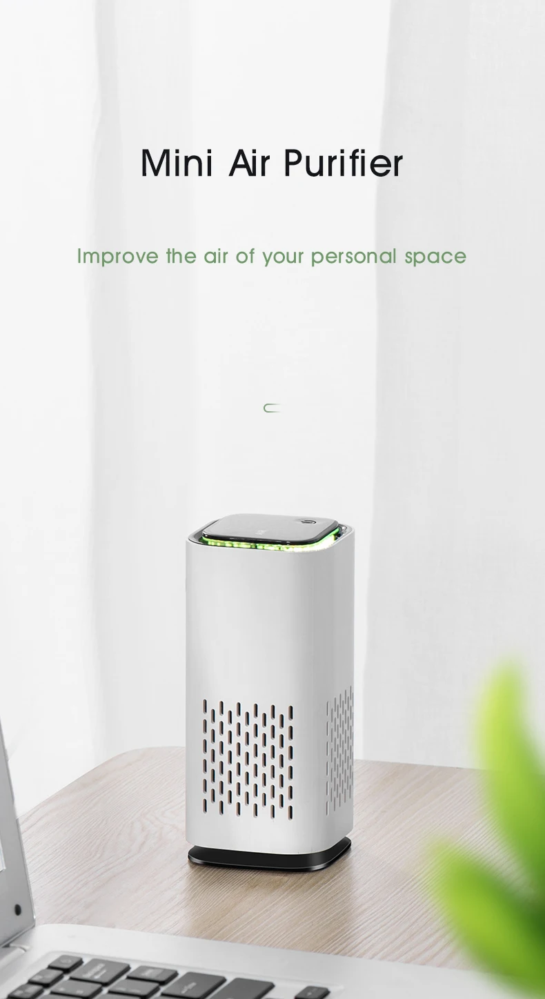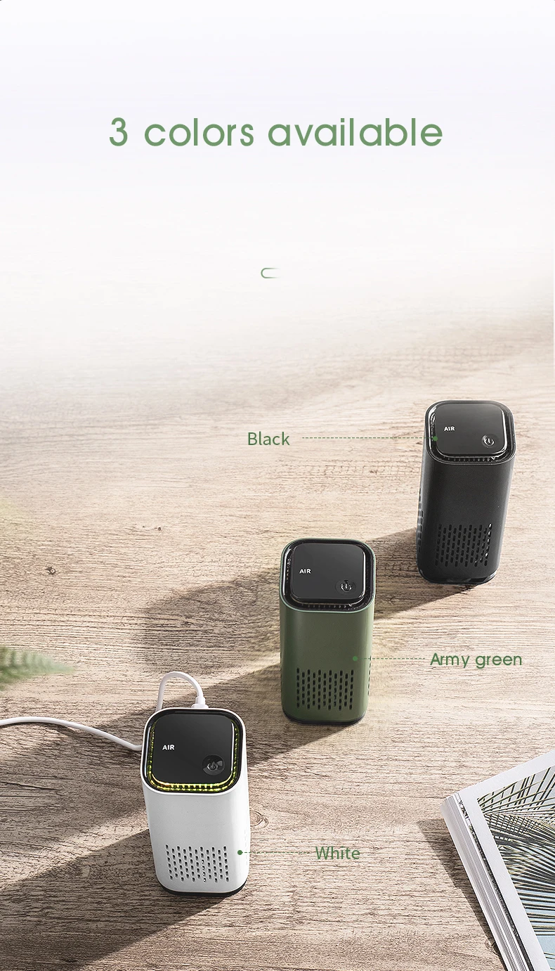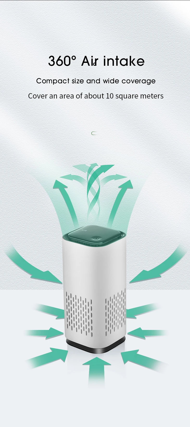 Portable And Compact Size: 60 x 60 x 131.8MM, Weight: 250 grams. It can cover area of about 10-20 square meters. Perfect solution for small areas and rooms such as studio, bedroom, office desktop, kitchen, pet room. air purifier does not emit UV and harmful air pollutants.