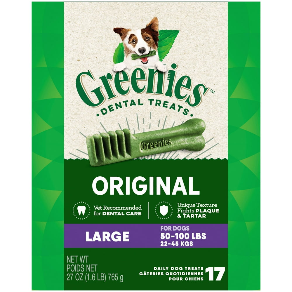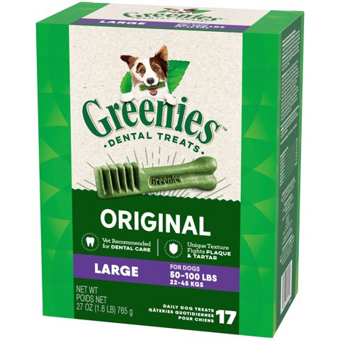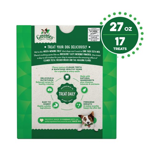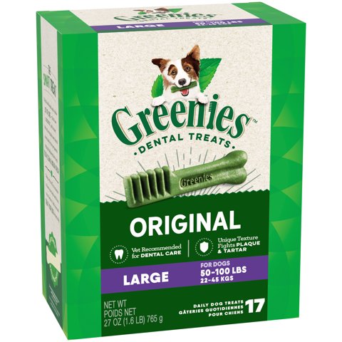 One Original Dental Treat a day is all it takes for clean teeth, fresh breath, and a happy dog. Large breeds can`t wait to sink their teeth into these delicious, original-flavor dental dog breath chews because they feature a delightfully chewy texture that fights plaque and tartar. Irresistibly and incredibly powerful, Treats for Dogs are vet-recommended for at- health care and accepted by the VOHC (Veterinary Health Council.) Best of all, these natural dog breath treats are made with highly soluble ingredients that are safe and easy to digest. Give your large dog the mouth-wowing treat that helps promote their overall health with Greenies Dog Treats. Natural Dog Treats Plus Vitamins, Minerals, and Other Nutrients.
